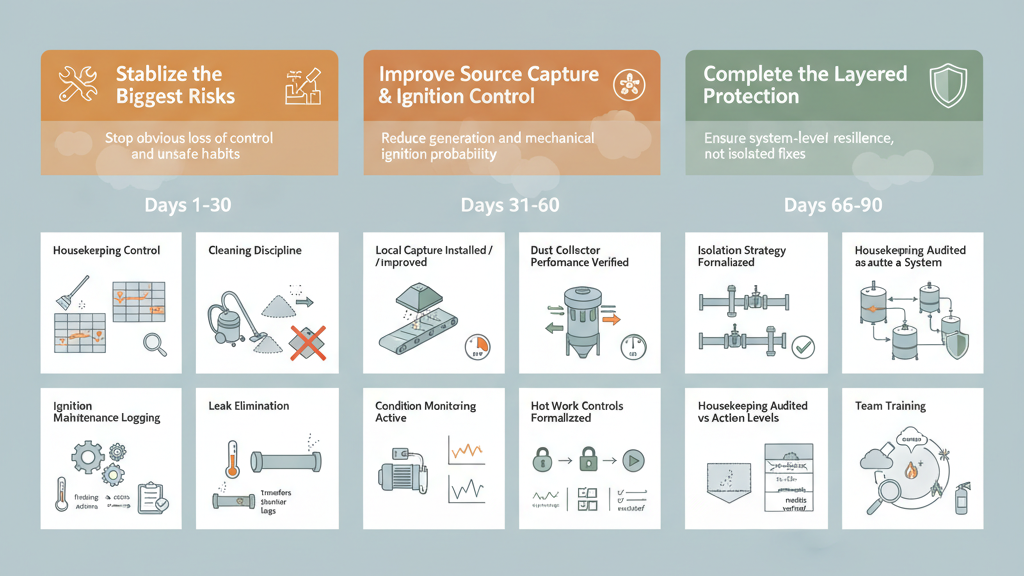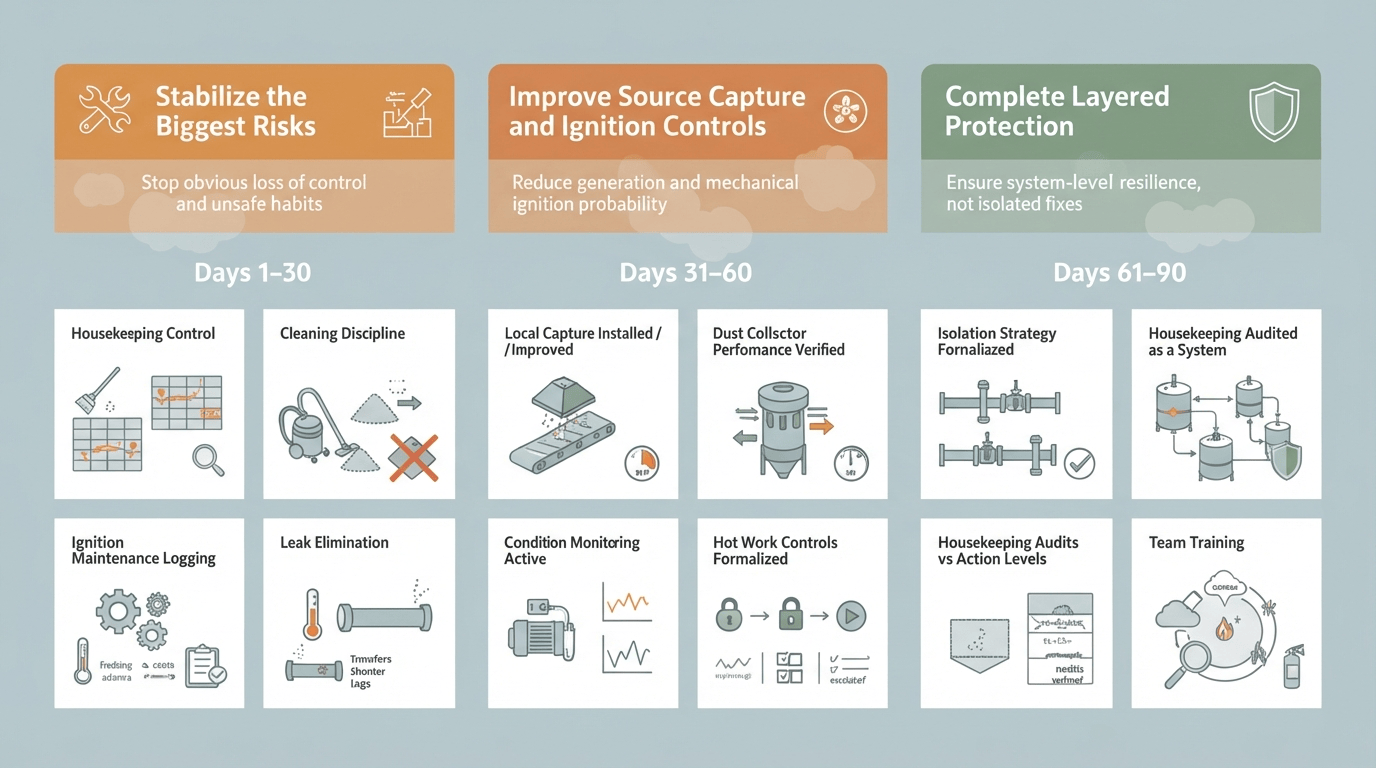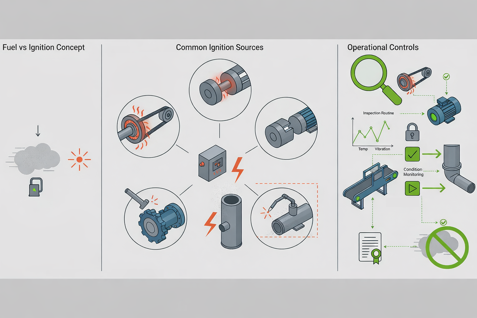 • Train teams on the full chain: dust, dispersion, confinement, ignition, and response