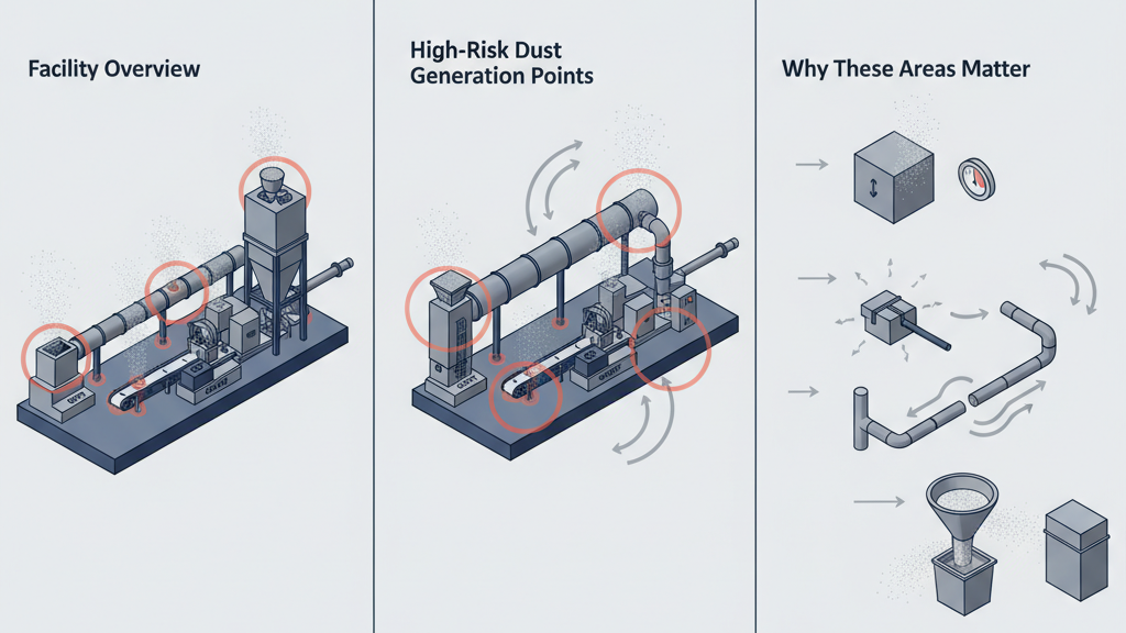 Before you change equipment or write new procedures, map where dust forms and where it accumulates.